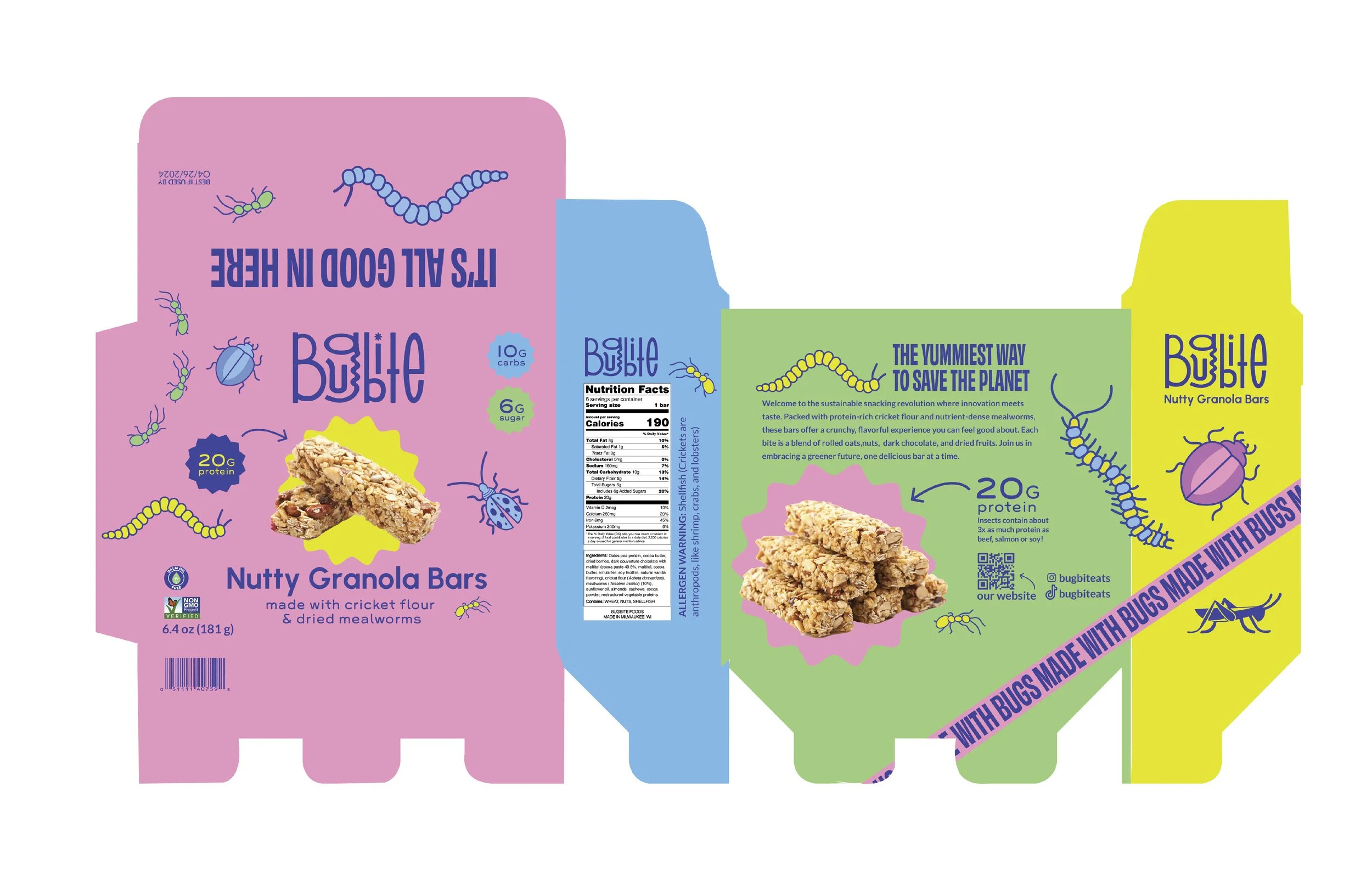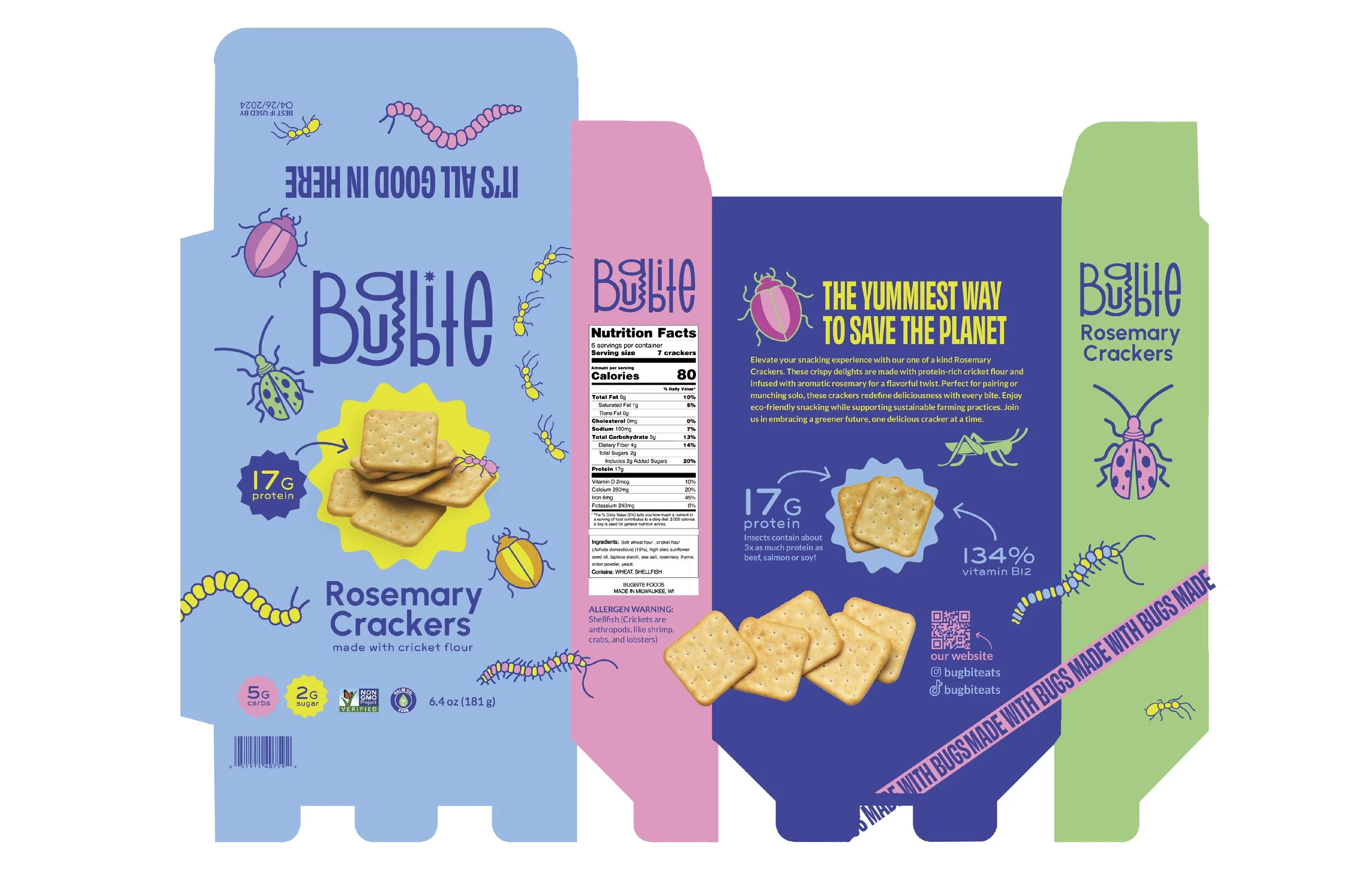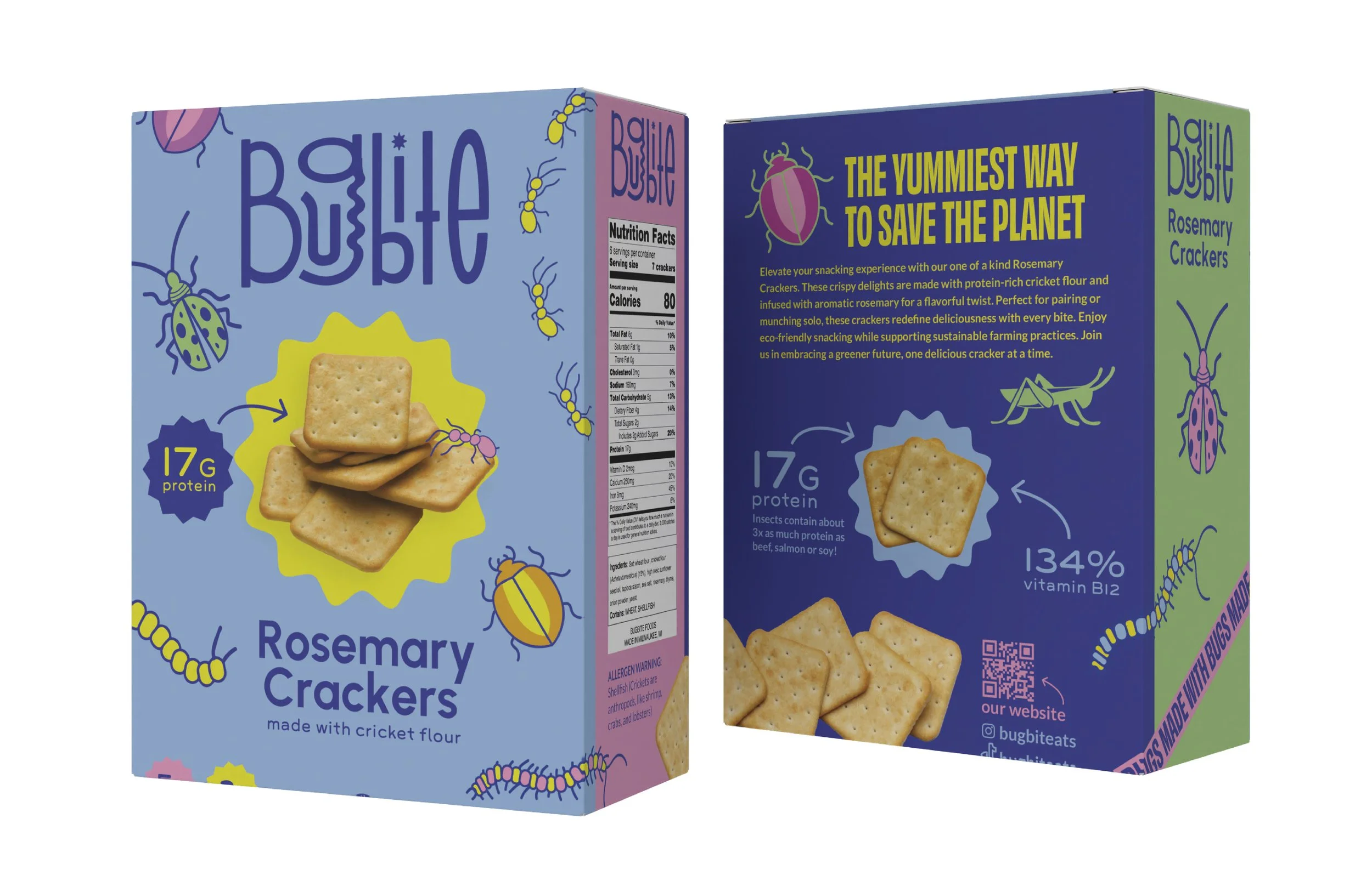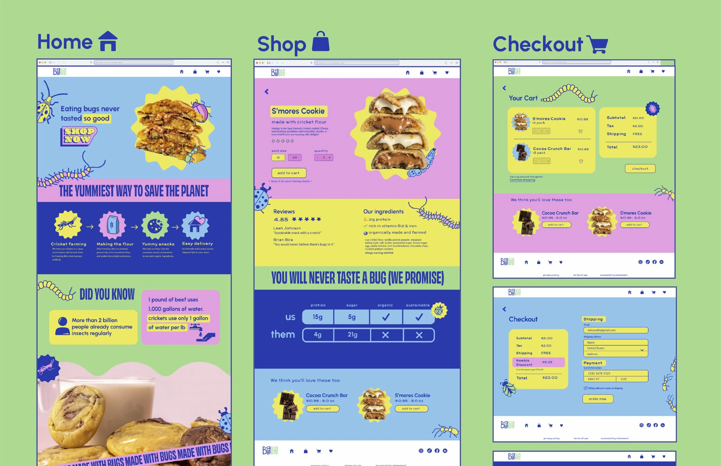 My senior thesis, Bugbite, was created to normalize eating bugs for young adults in the U.S. While eating insects is a cherished tradition in regions of Asia, Africa, and Latin America, many individuals in the U.S. would recoil at the thought. Bugbite addresses this by incorporating cricket flour into familiar Gen Z snacks and adopting a vibrant and friendly approach. Beyond the brand’s dynamic color schemes, inventive typography, and friendly insects, I designed Bugbite as a way to expand our understanding of food and its impact on the planet—one bite at a time.