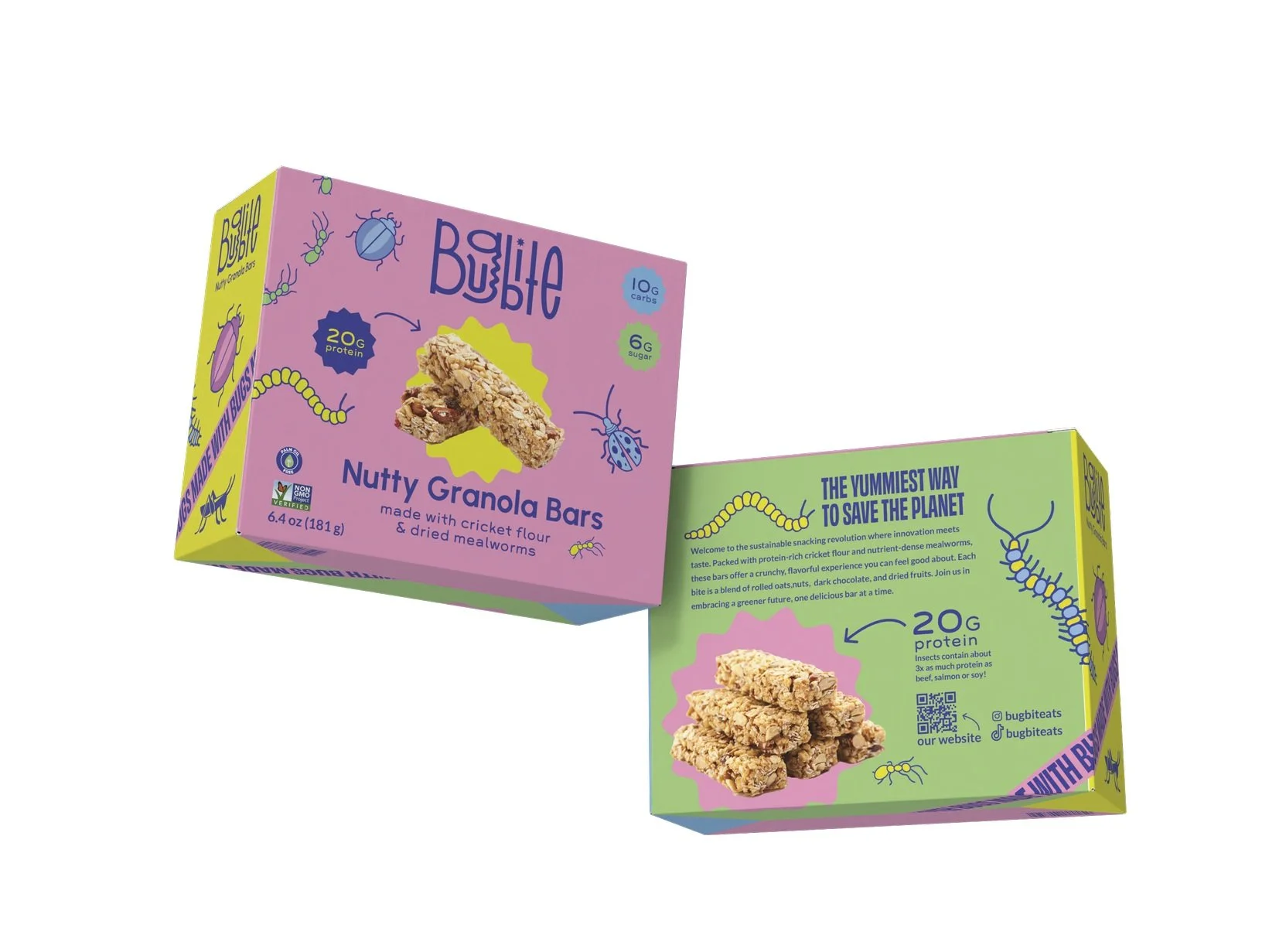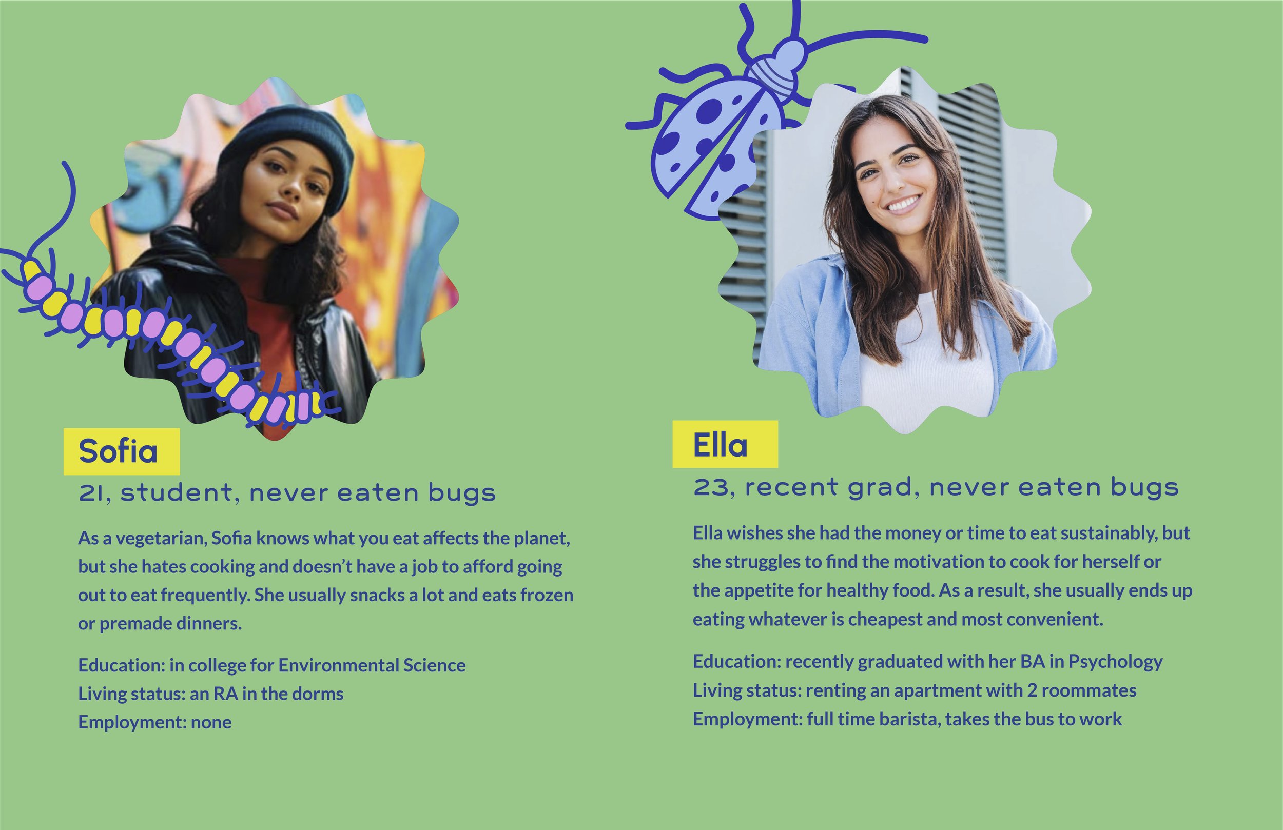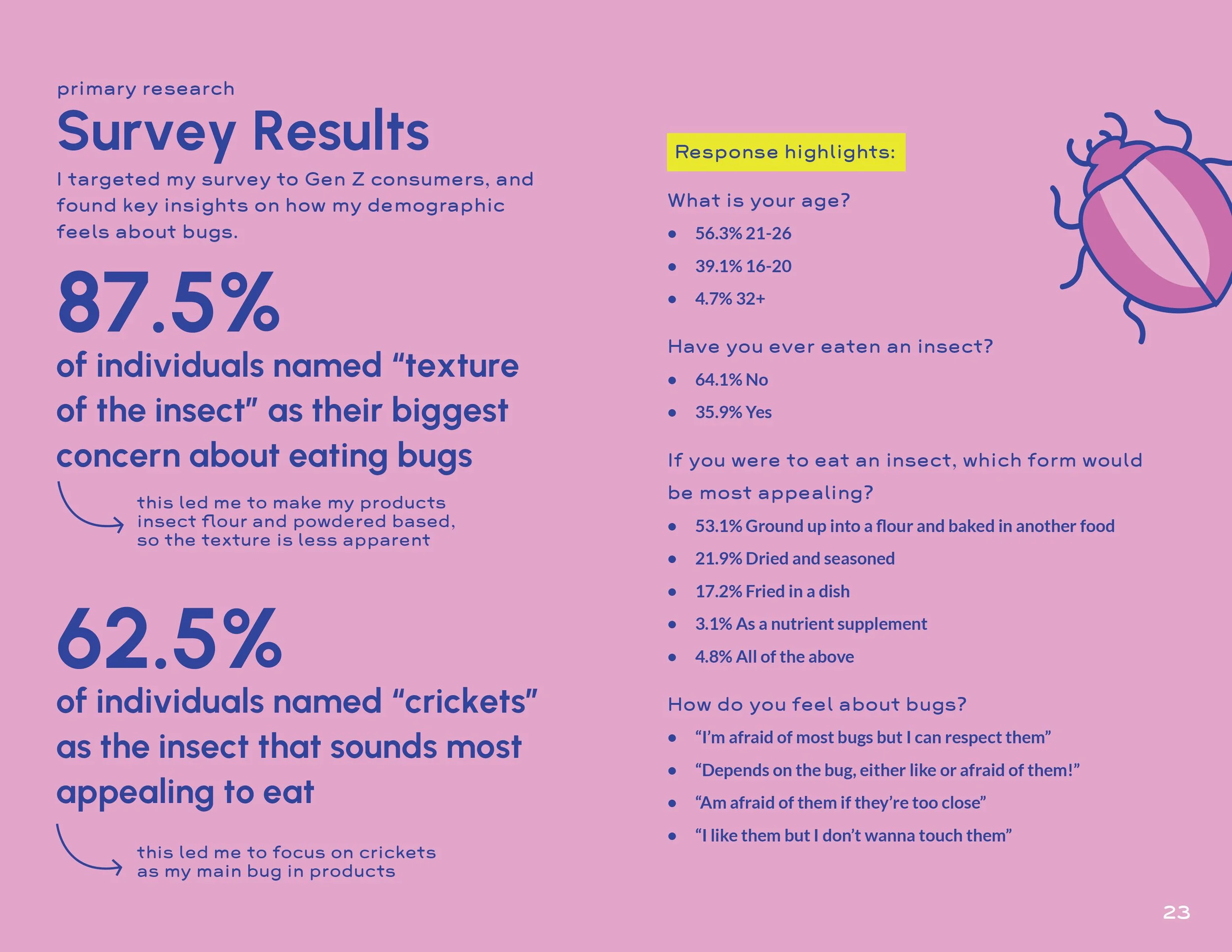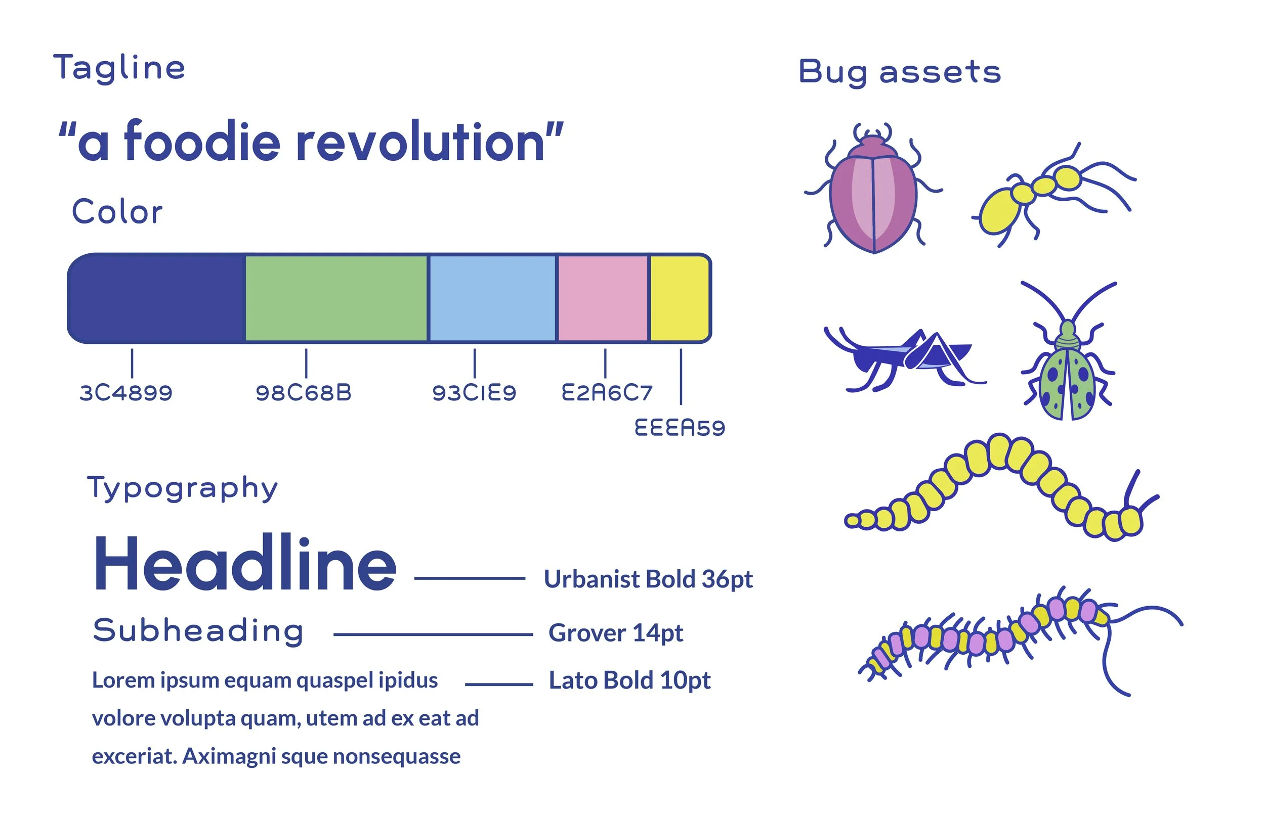 My senior thesis, Bugbite, was created to normalize eating bugs for young adults in the U.S. While eating insects is a cherished tradition in regions of Asia, Africa, and Latin America, many individuals in the U.S. would recoil at the thought. Bugbite addresses this by incorporating cricket flour into familiar Gen Z snacks and adopting a vibrant and friendly approach. Beyond the brand’s dynamic color schemes, inventive typography, and friendly insects, I designed Bugbite as a way to expand our understanding of food and its impact on the planet—one bite at a time.