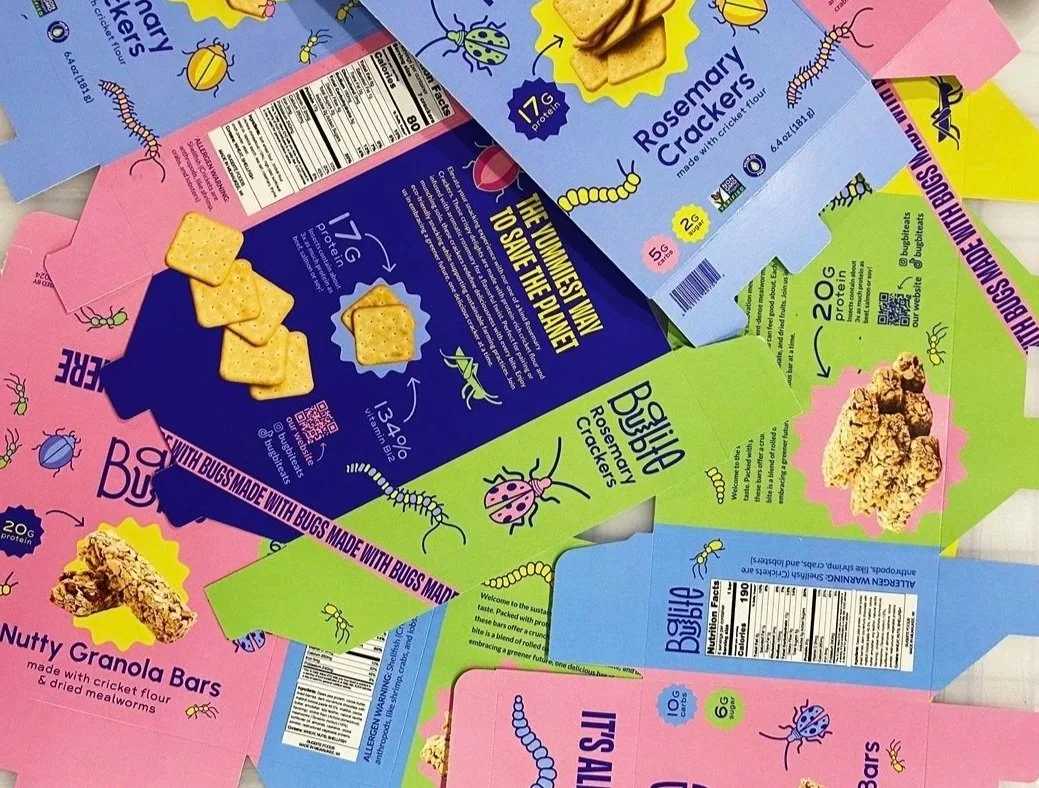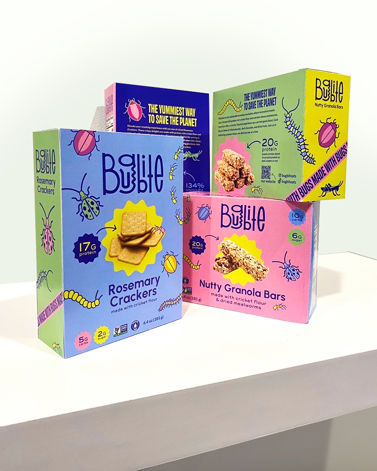 My senior thesis, Bugbite, was created to introduce eating insects in a fun and approachable way. By blending cricket flour into familiar Gen Z snacks and using vibrant colors, playful typography, and friendly insect characters, the brand invites people to rethink food, sustainability, and our planet—one bite at a time.